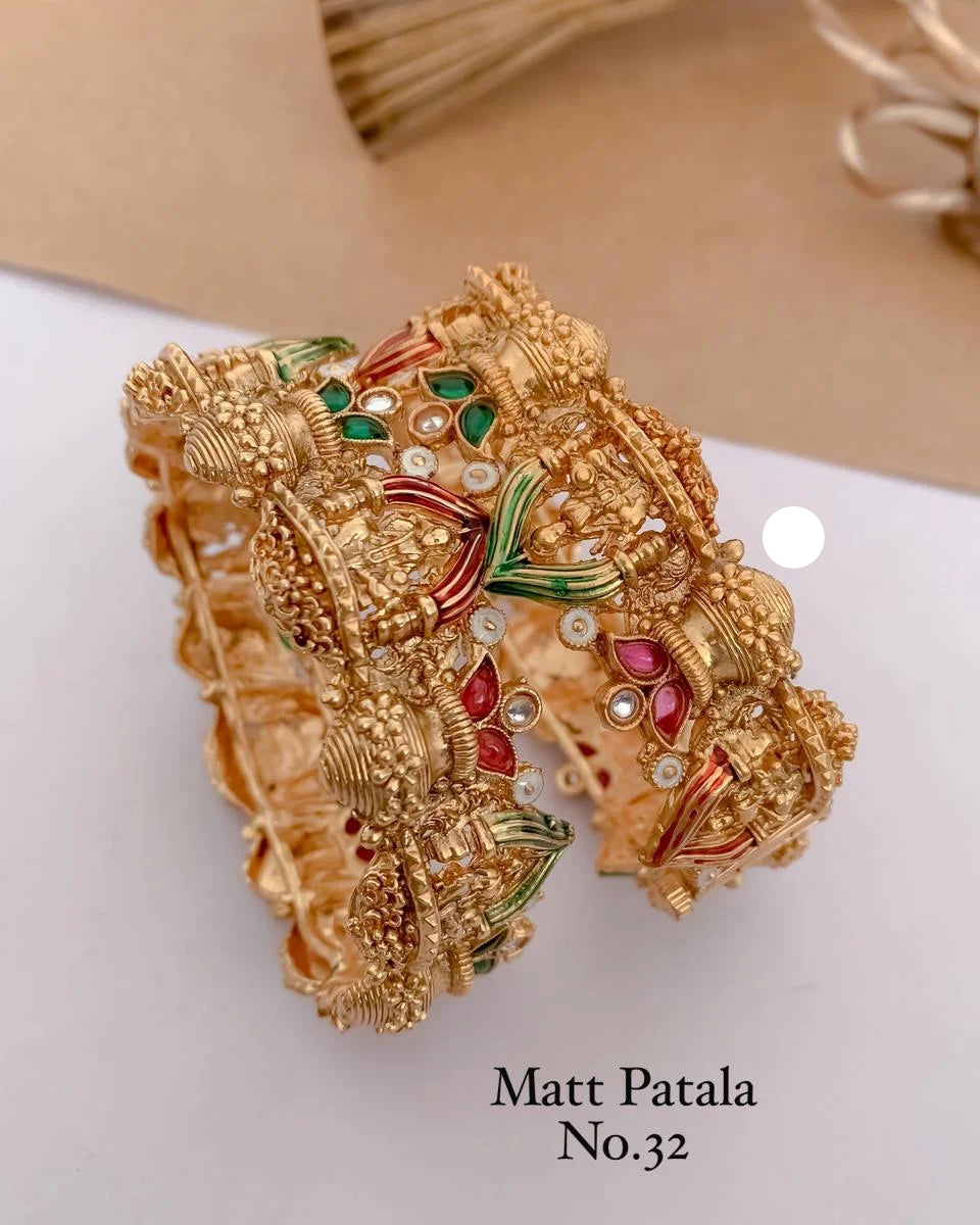 An exquisite antique-finish matt patala bangle inspired by traditional South Indian temple jewellery. Featuring intricate goddess motifs with delicate ruby and emerald colour stones, this statement bangle brings divine elegance and royal charm to every festive and bridal look.